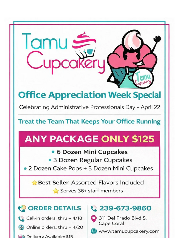 1 flavor of our delicious cupcakes in Cape Coral is sure to delight your taste buds, whether you're looking for sweet treats in Cape Coral, FL, or specifically craving cupcakes from Cape Coral, Florida. Don't forget to try our special Tamu cupcakes for a unique twist!