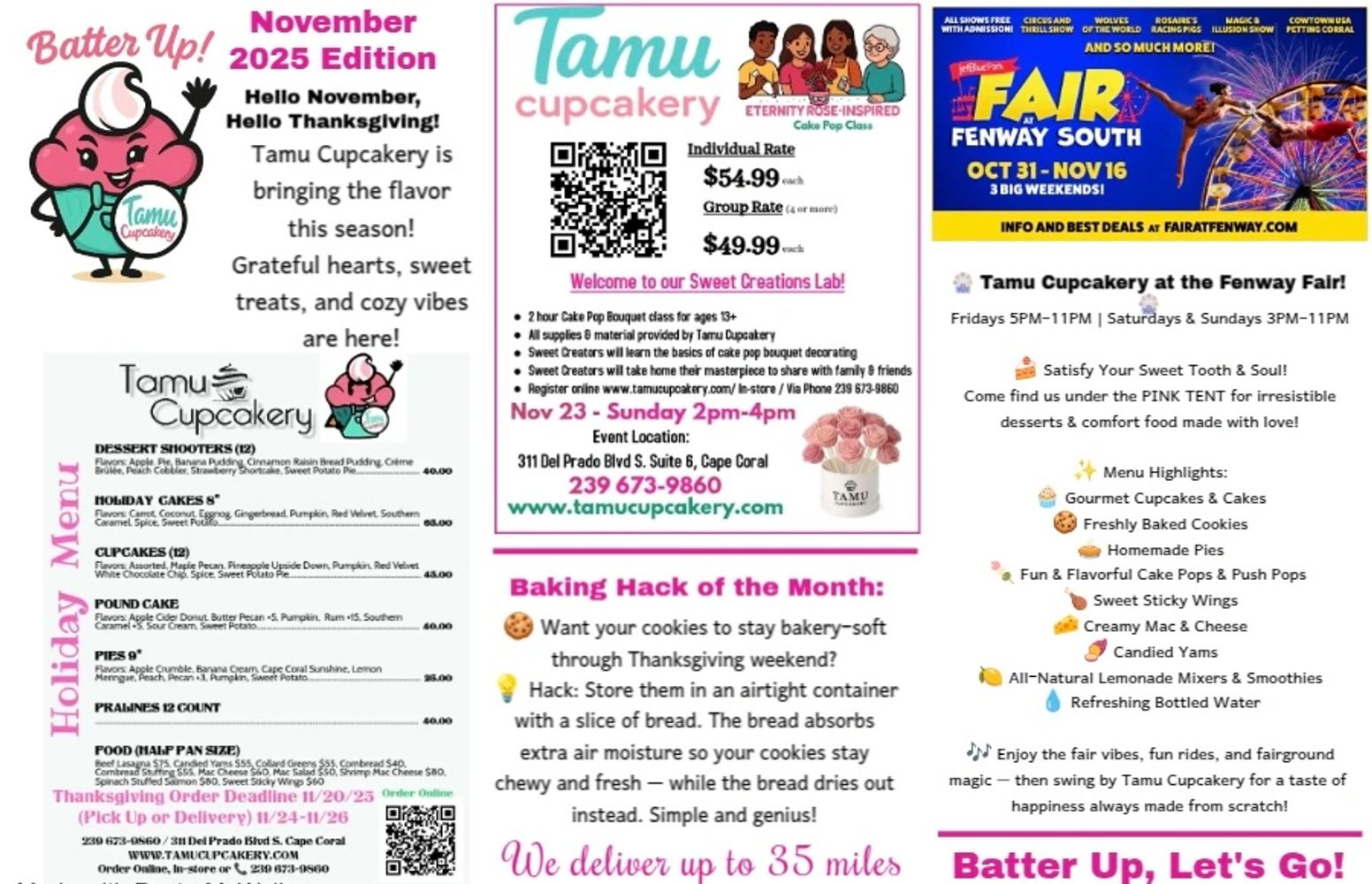 Our delicious cupcakes in Cape Coral are available for in-store purchase, including our popular Tamu cupcakes. Whether you're looking for cupcakes in Cape Coral, FL, or exploring the sweet options in Cape Coral, Florida, we've got you covered.